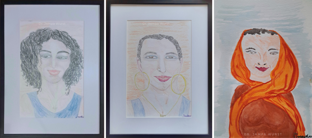 Dieselbe Frau, einmal mit Perücke, einmal ohne. Ist eine Frau nur eine Frau, wenn sie lange Haare trägt? Kann das die Person verunsichern in ihrer Selbstwahrnehmung, die sich doch als Frau fühlt und als Frau gelesen werden möchte? Nur die Person selbst kann entscheiden, wer sie ist. Niemand hat das Recht, ihr abzusprechen, wer oder was sie ist, welches Gender sie ist oder welche Pronomen sie benutzt.